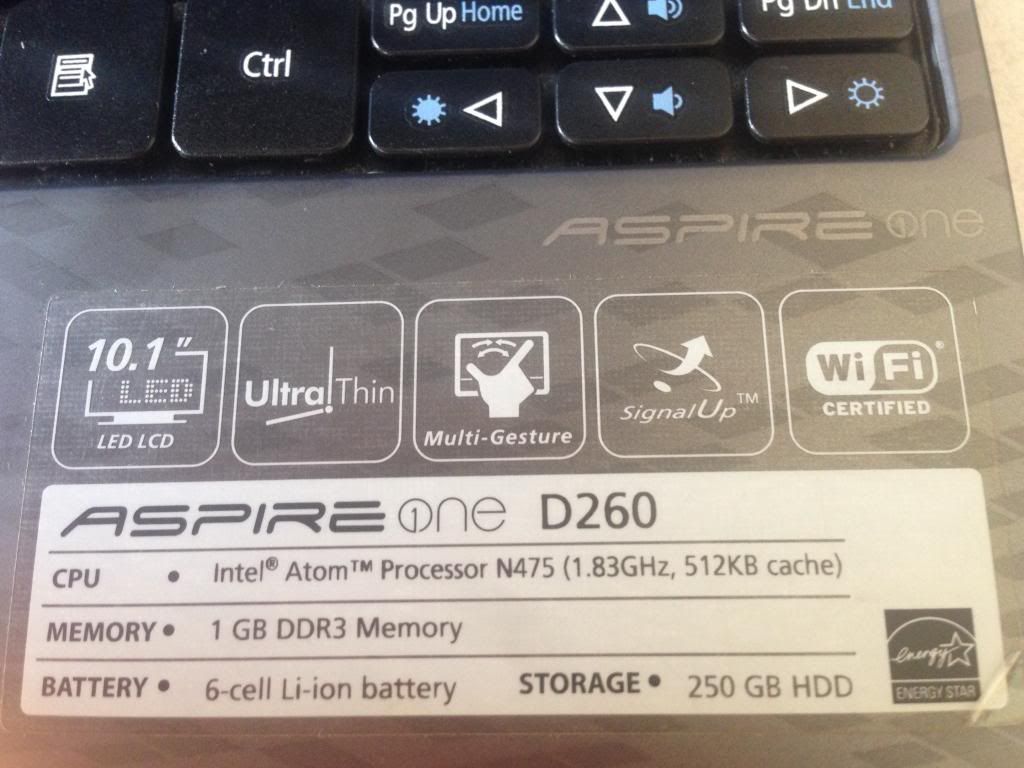 CPU: INtel Atom Processor N475. 1.83ghz, 512kb cache.