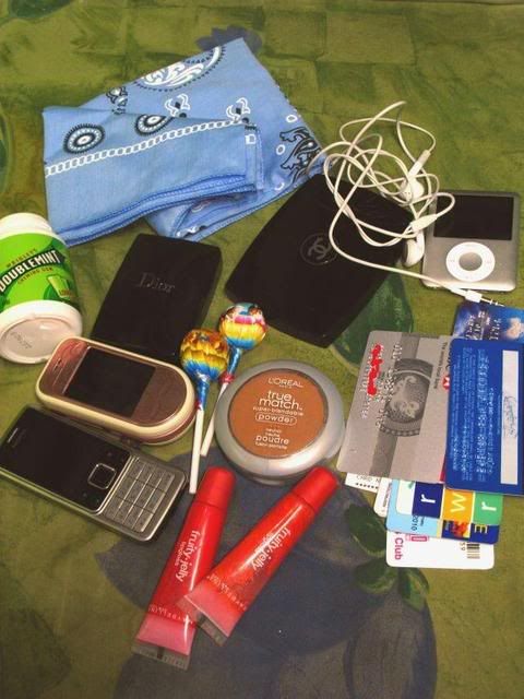 cellphone, wallet, comb, toothbrush, toothpaste, random junk (receipts, and etc), psp, charger hahaha daghaaan jud kayo