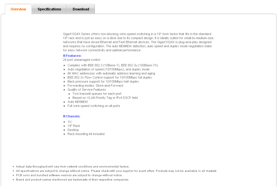 GigaX1024X Series offers non-blocking wire-speed switching in a 19" form factor that fits in the standard 19" rack and is just as easy on a desk due to its compact design. It is ideally suited for small-to-medium-size networks that have mixed Ethernet and Fast Ethernet devices. The GigaX1024X is plug-and-play designed and requires no configuration. The auto MDI/MDIX detection, auto speed and duplex mode negotiation make for easy network connectivity and optimal performance.